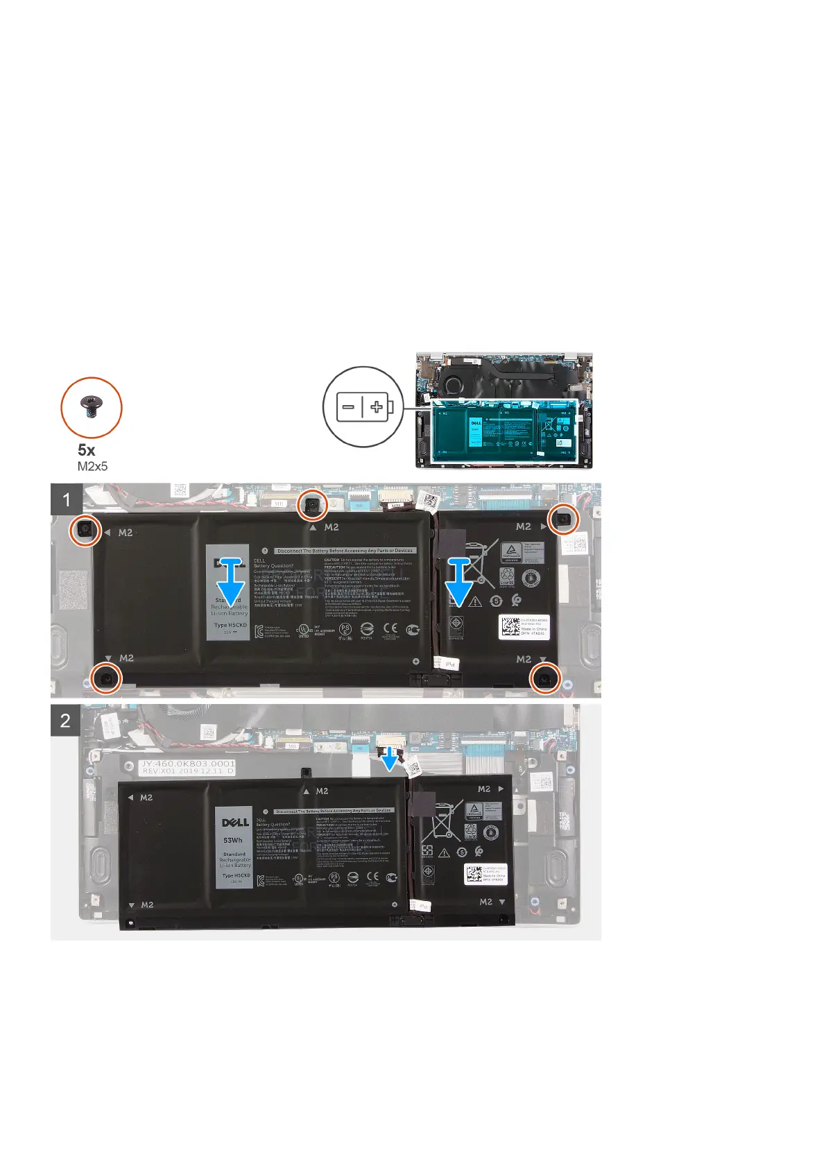 1. Remove the five screws (M2x5) that secure the battery to the palm-rest and keyboard assembly.