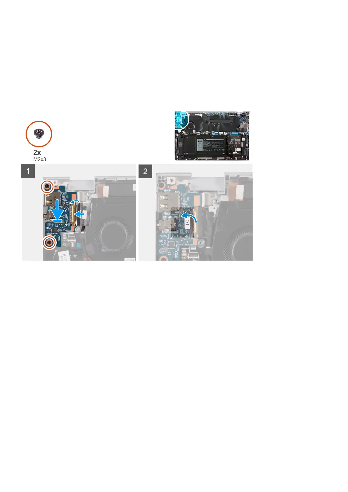 2. Replace the two screws (M2x3) that secure the I/O board to the palm-rest and keyboard assembly.
