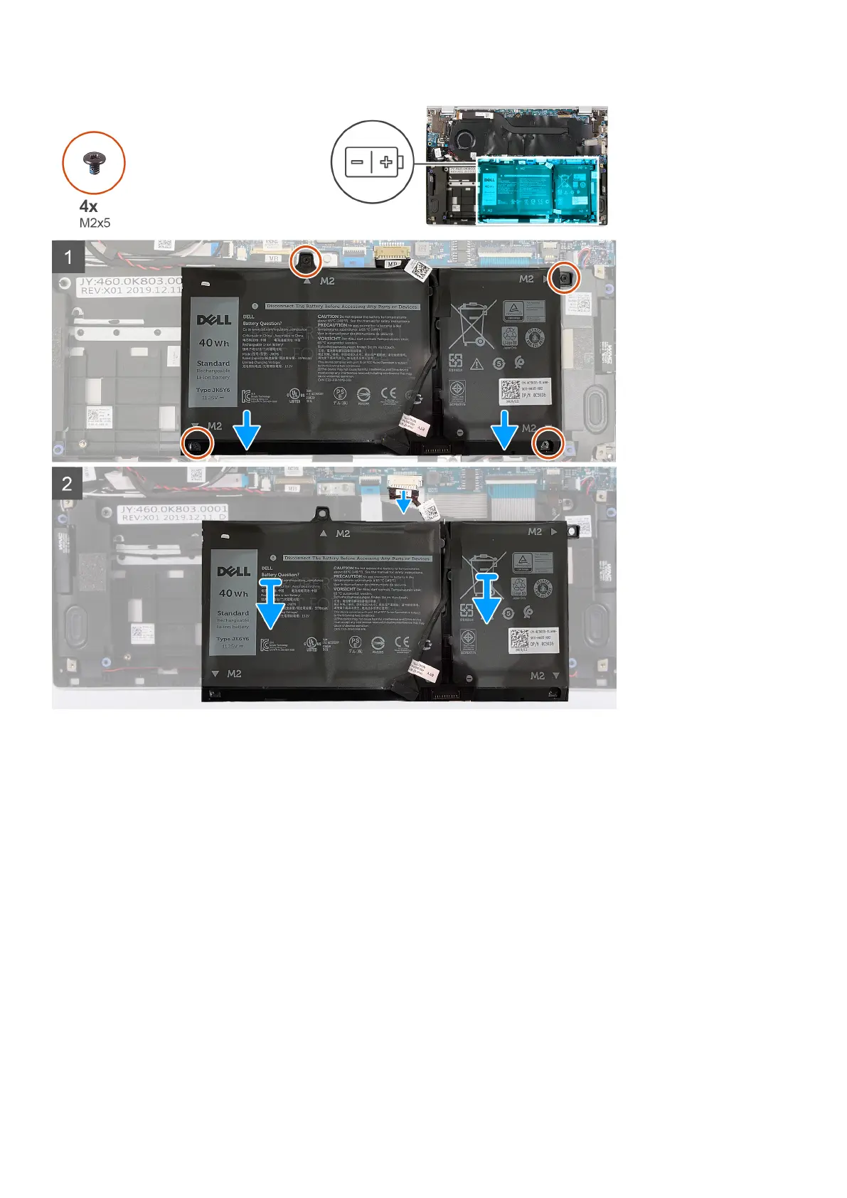 1. Remove the four screws (M2x5) that secure the battery to the palm-rest and keyboard assembly.
