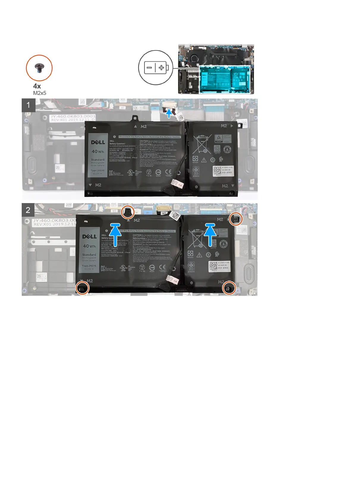 3. Replace the four screws (M2x5) that secure the battery to the palm-rest and keyboard assembly.