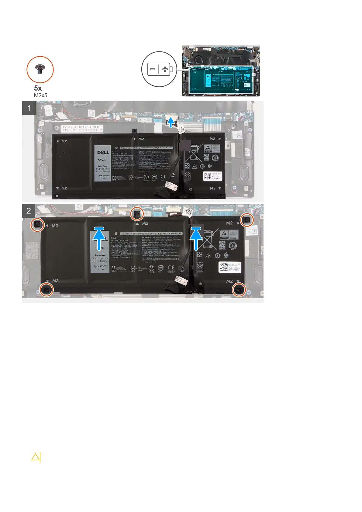 3. Replace the five screws (M2x5) that secure the battery to the palm-rest and keyboard assembly.