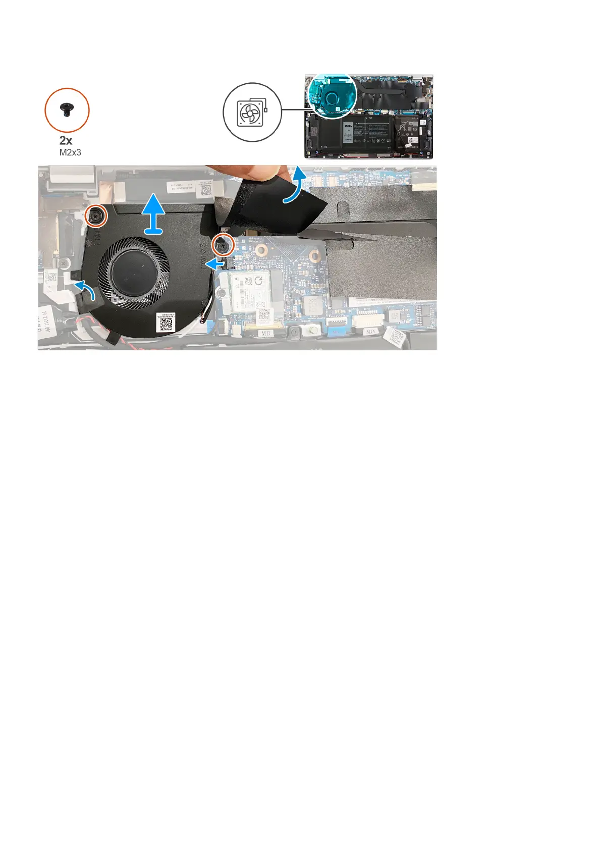 3. Remove the two screws (M2x3) that secure the fan to the system board.