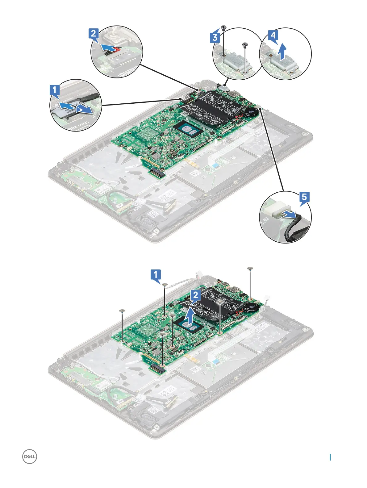 e Remove the six M2.0 x 2 screws that secure the system board to the system [1].