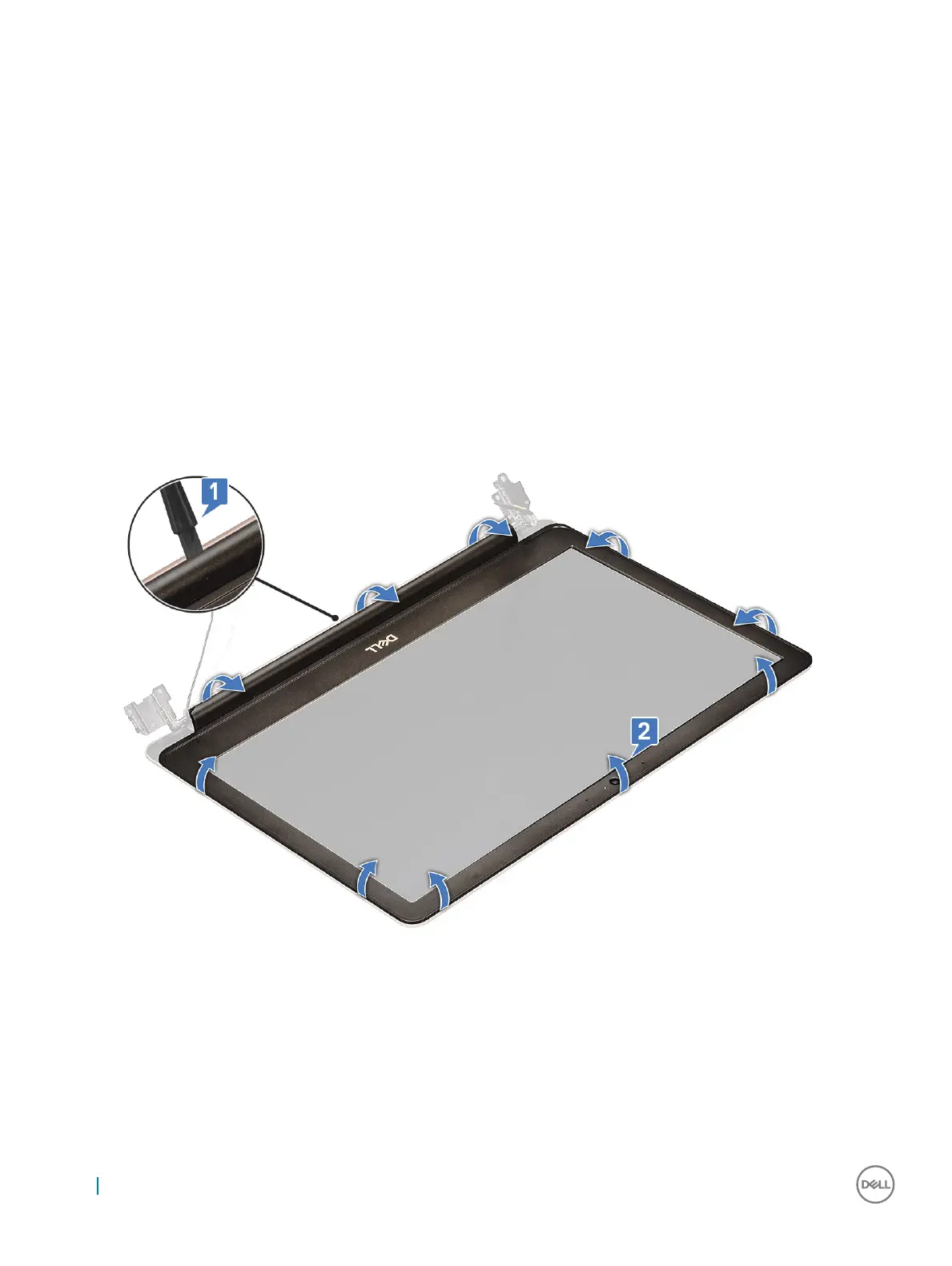 a Using a plastic scribe, pry the outer edges to release the display bezel from the display assembly [1, 2].