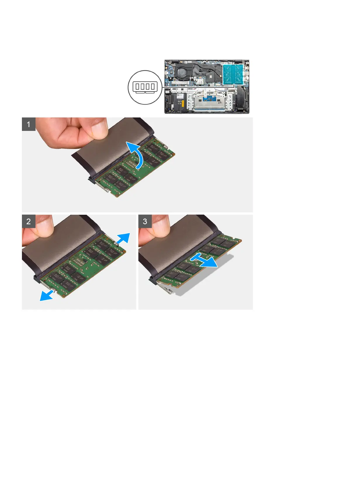 The figure indicates the location of the memory module and provides a visual representation of the removal procedure.