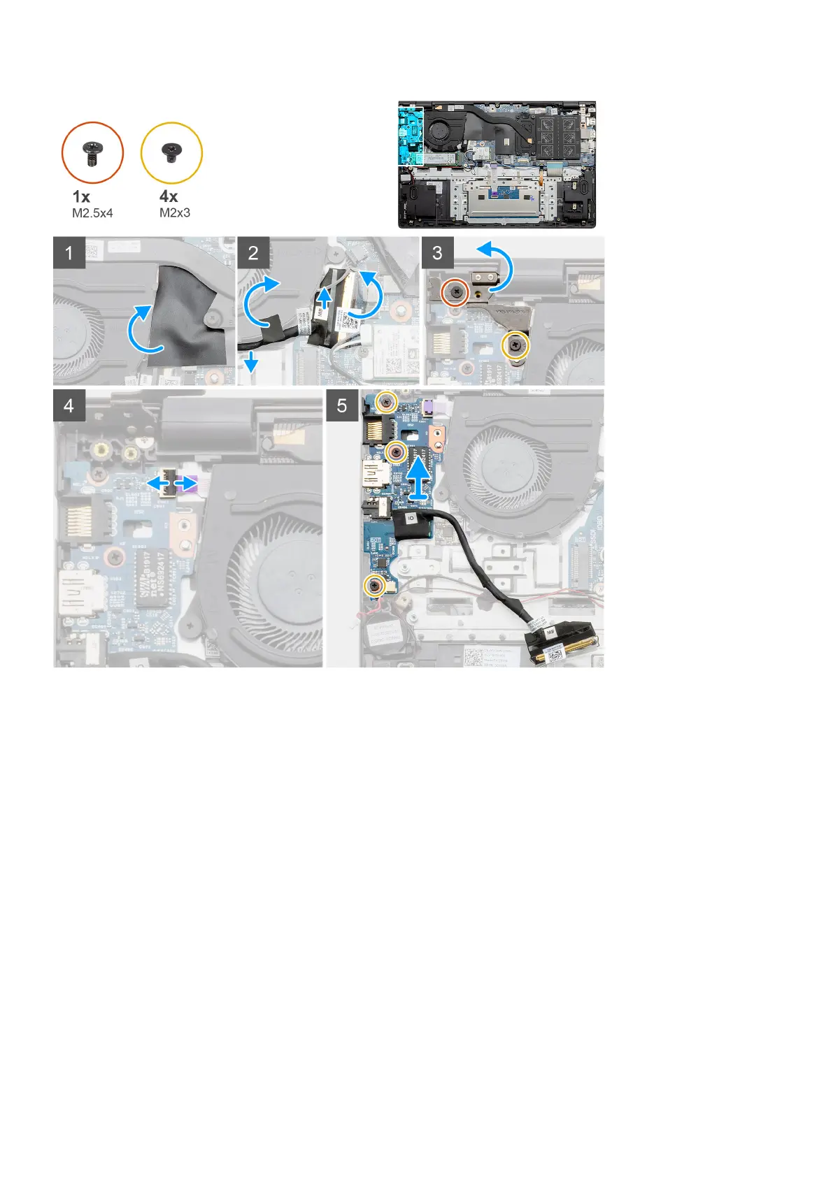 7. Remove the three screws (M2x3) that secure the I/O board to the palm-rest and keyboard assembly.