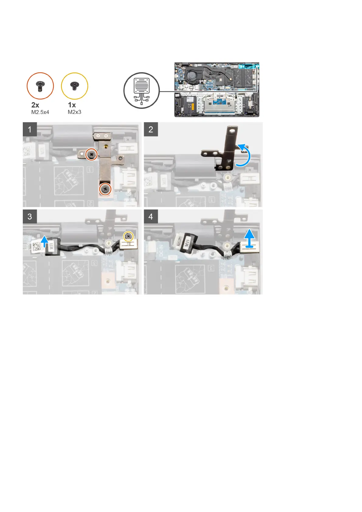 3. Remove the single screw (M2x3) screw and lift the DC-in port.
