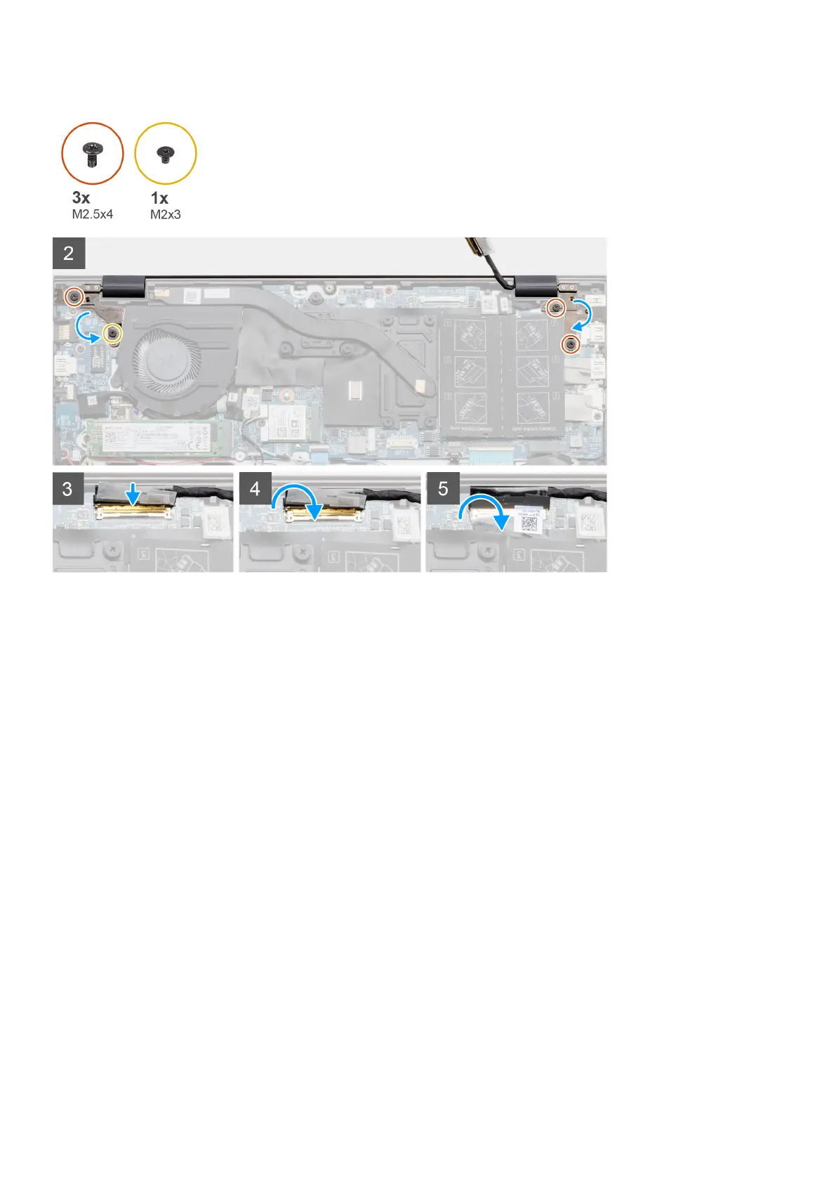 4. Replace the two screws (M2.5x4) and (M2x3) that secure the left-display hinge to the system board.