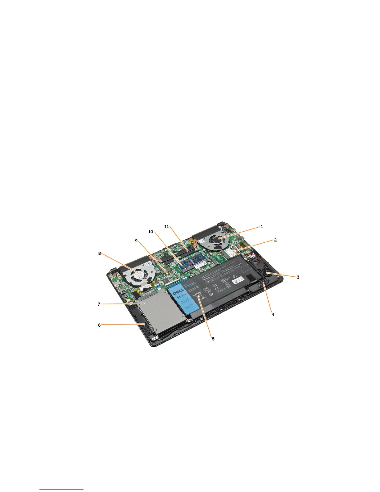 The figure below displays the inside view of the back of the computer after the base cover has been removed. The call
