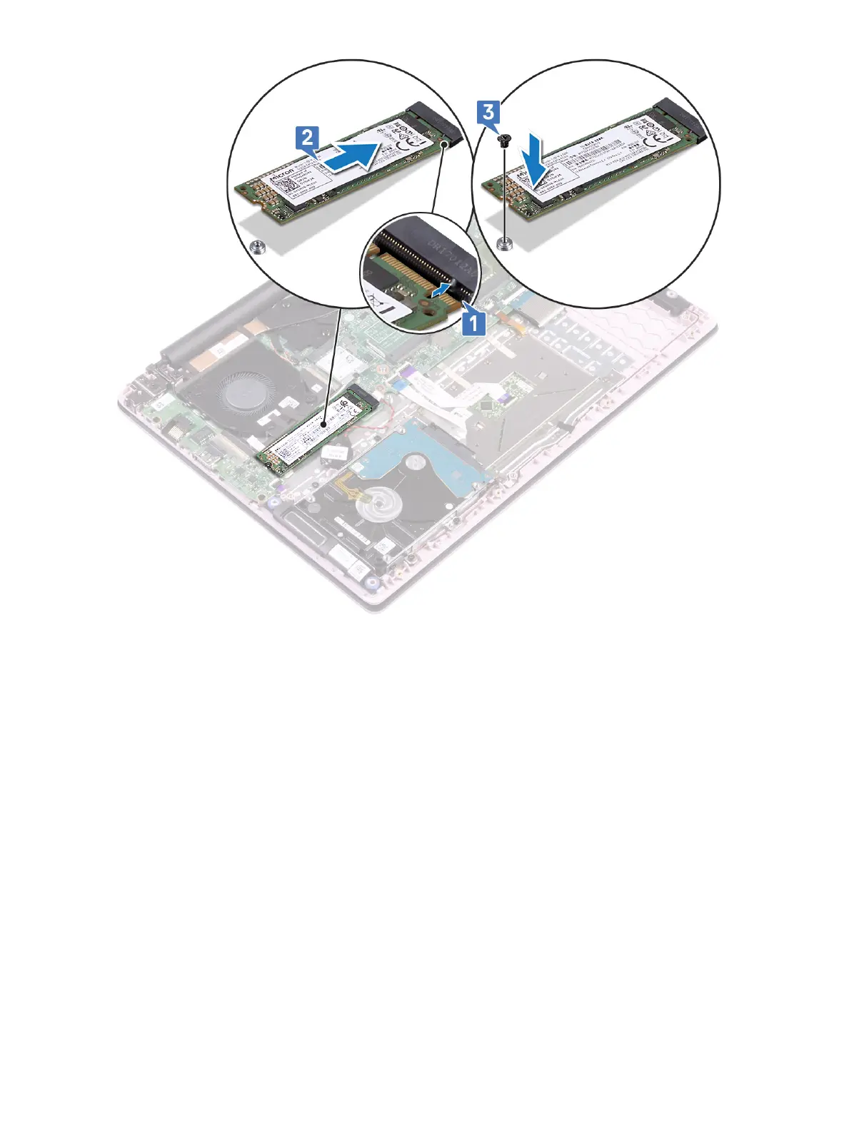 b Replace the single (M2x3) screw to secure the SSD module to the palmrest and keyboard assembly [2].