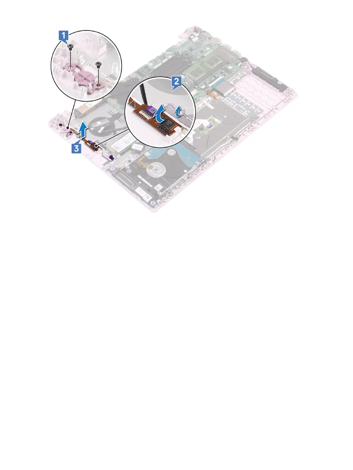 3 Ax the ngerprint reader cable and the ngerprint reader board to the palmrest and keyboard assembly [3].