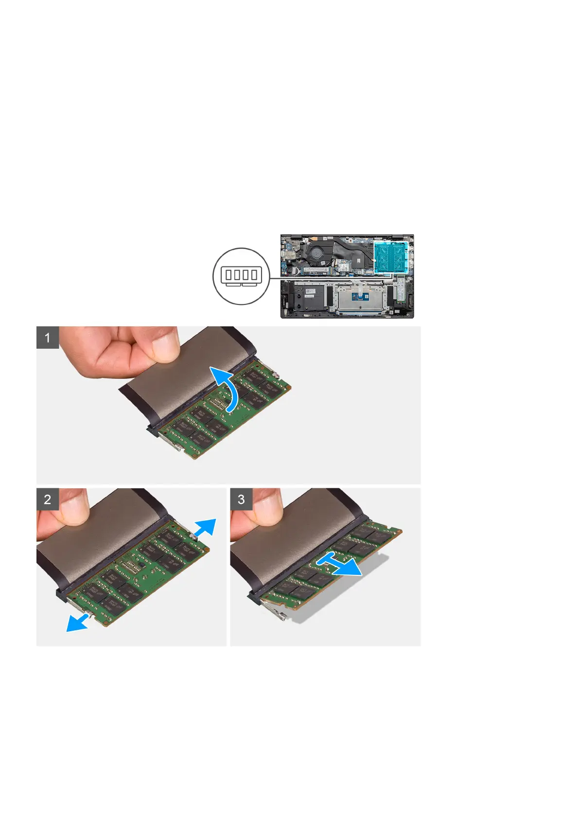 The figure indicates the location of the memory module and provides a visual representation of the removal procedure.