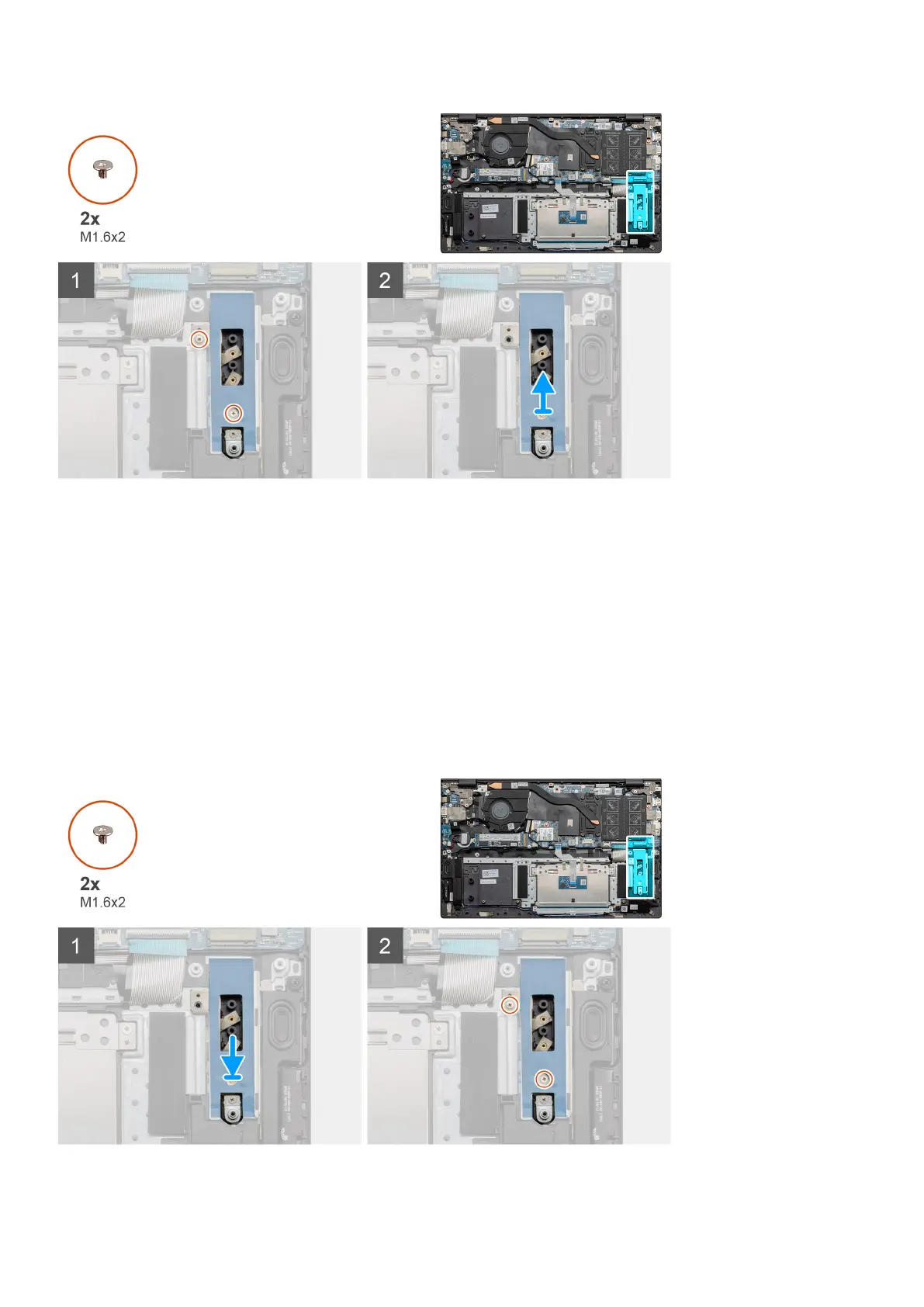 1. Remove the two screws (M1.6x2) that secures the thermal support bracket to palm-rest and keyboard assembly.