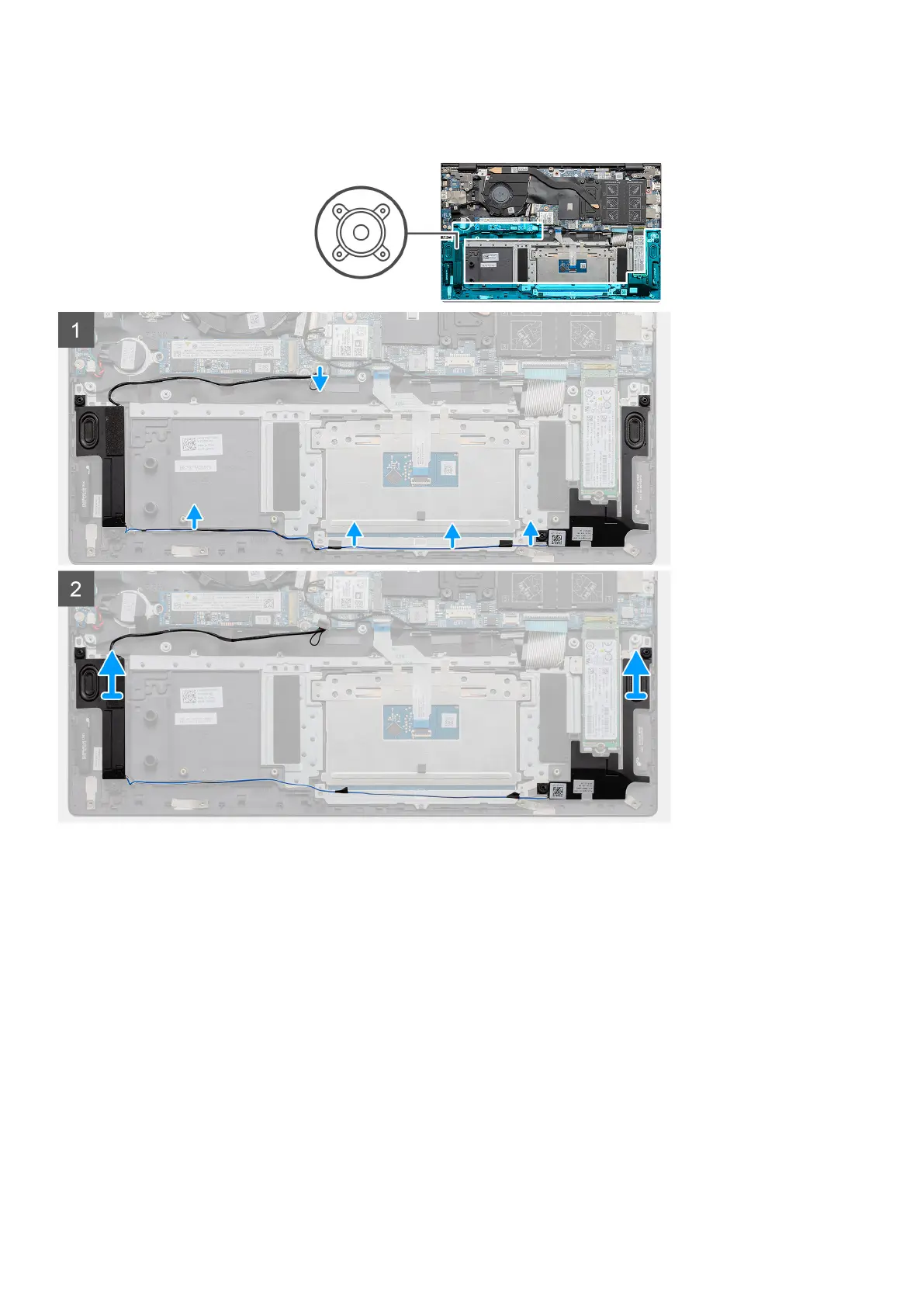 5. Lift the speakers, along with the cable, off the palm-rest and keyboard assembly.