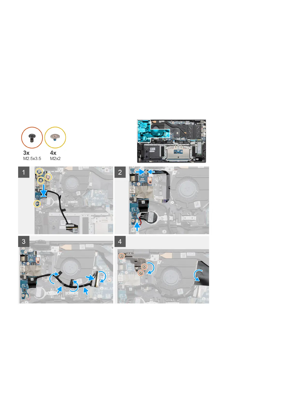 3. Replace the four screws (M2x2) that secure the I/O board to the palm-rest and keyboard assembly.