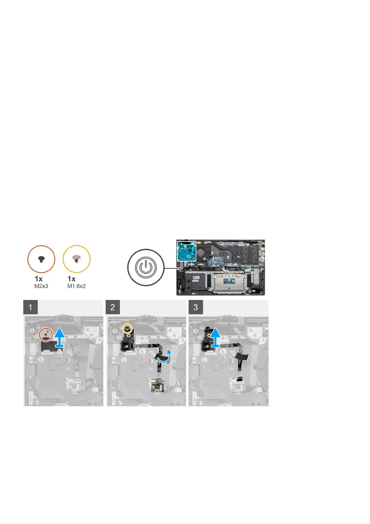 2. Remove the single screw (M1.6x2) that secures the power button with optional fingerprint reader to the palm-rest and keyboard