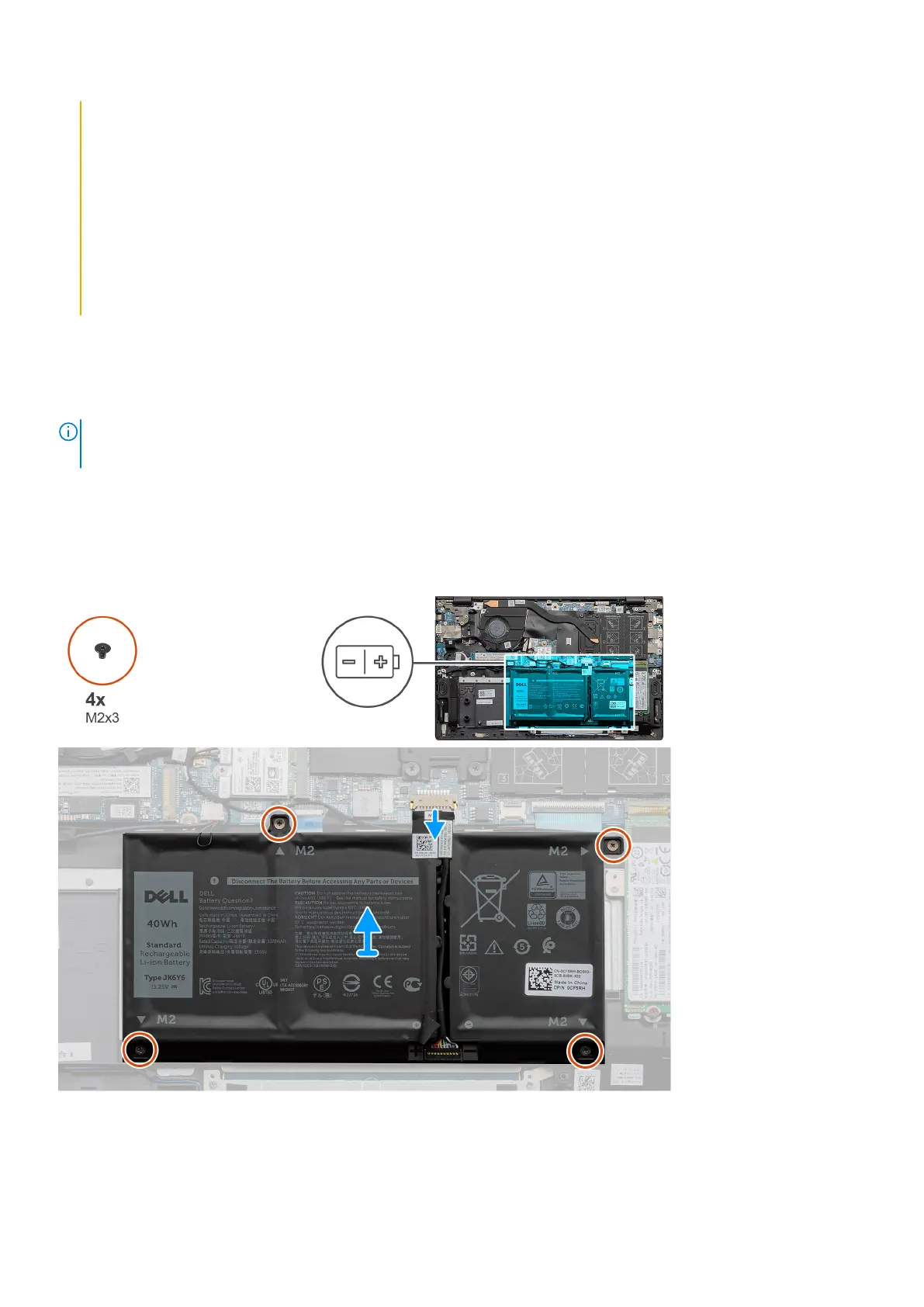 2. Remove the four screws (M2x3) that secure the battery to the palm-rest and keyboard assembly.