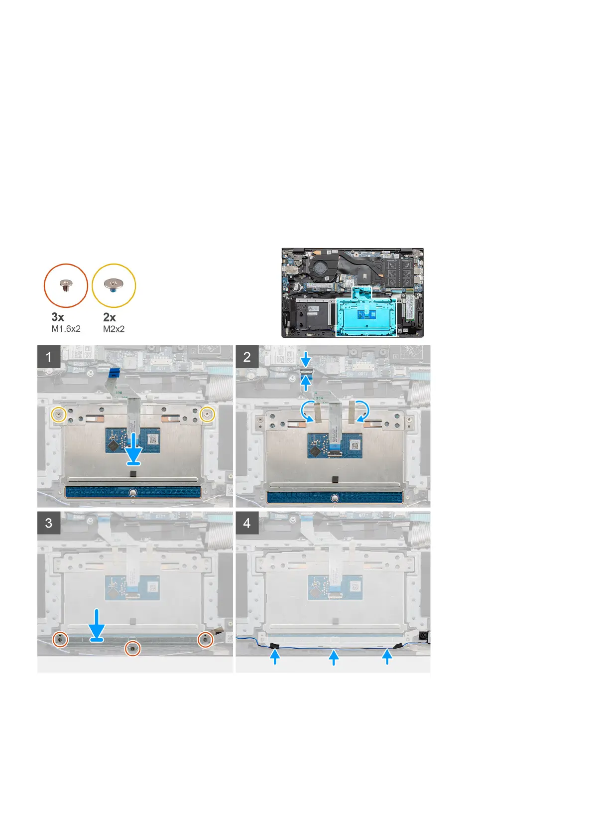 2. Replace the two (M2x2) screws along with the bracket to secure the touchpad to the palm-rest and keyboard assembly.