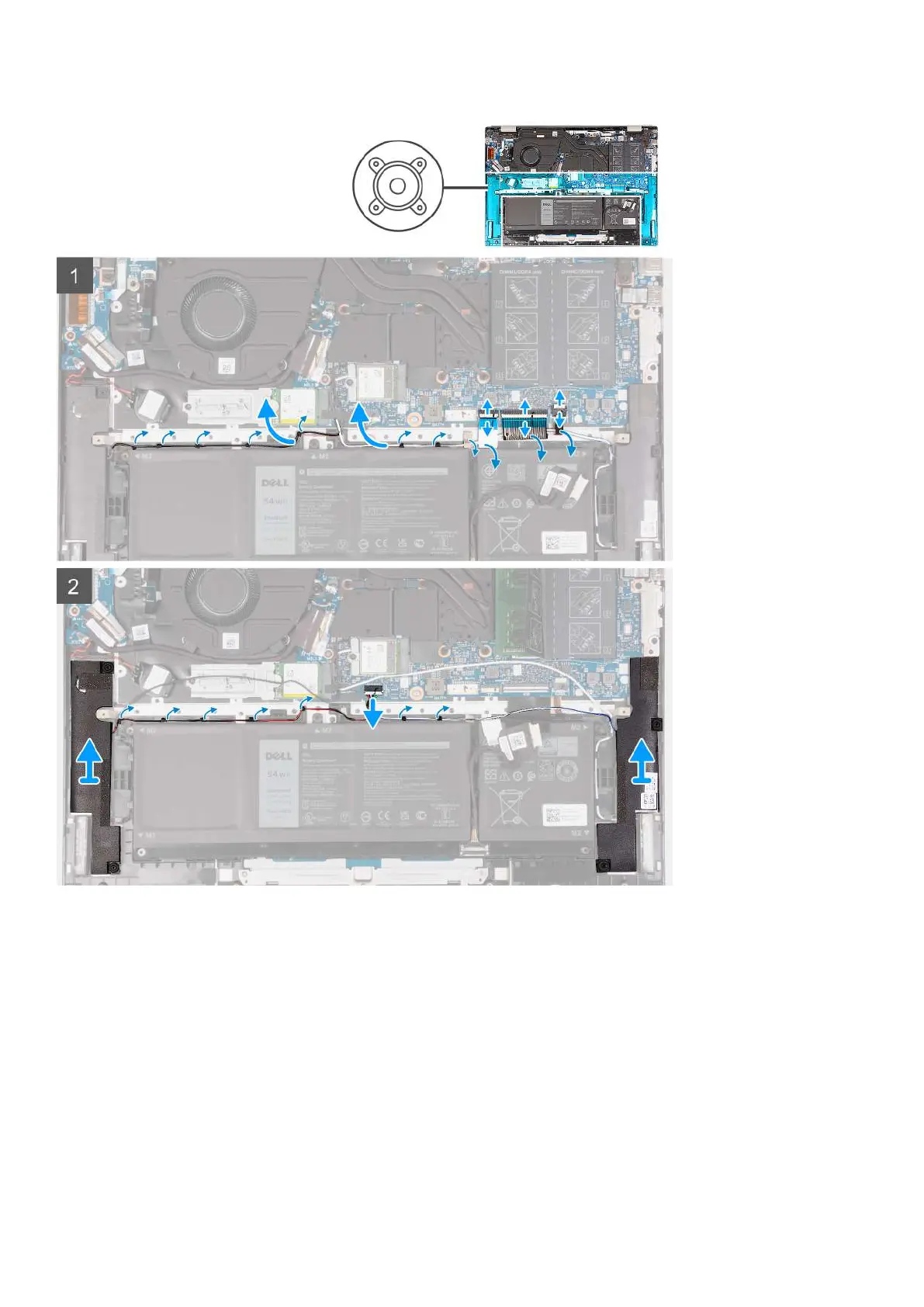 4. Remove the speakers cable from the routing guides on the palm-rest and keyboard assembly.