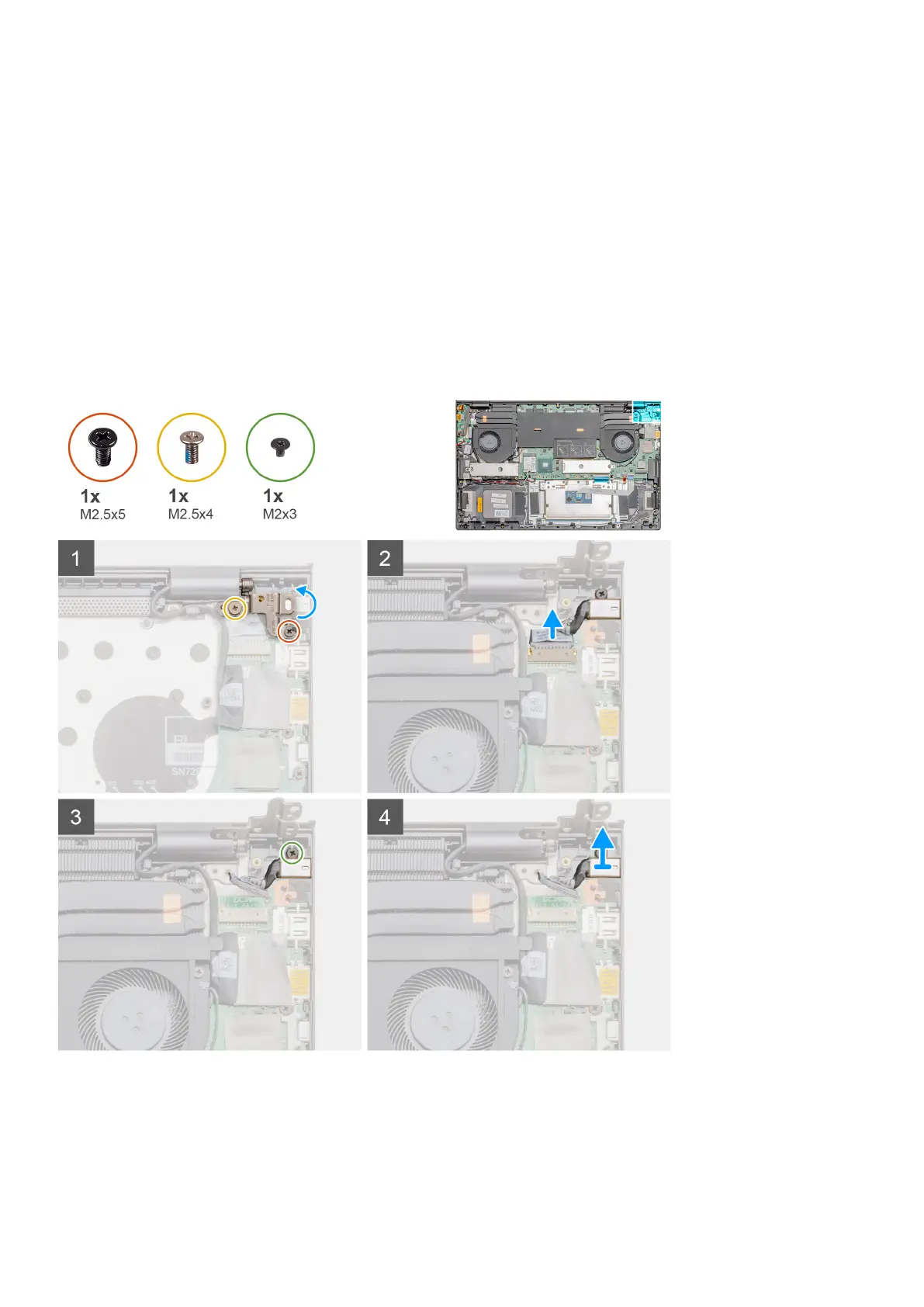 1. Remove the two screws (M2.5x5) and (M2.5x4) that secure the left display hinge to the palm-rest and keyboard assembly.
