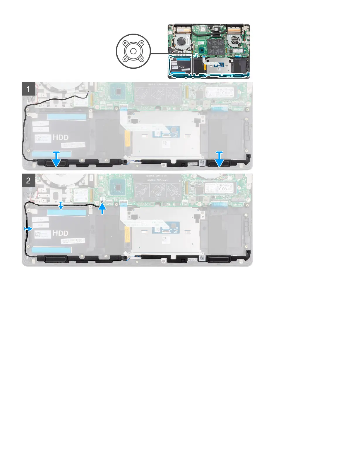 2 Route the speaker cable through the routing guides on the palm-rest and keyboard assembly.
