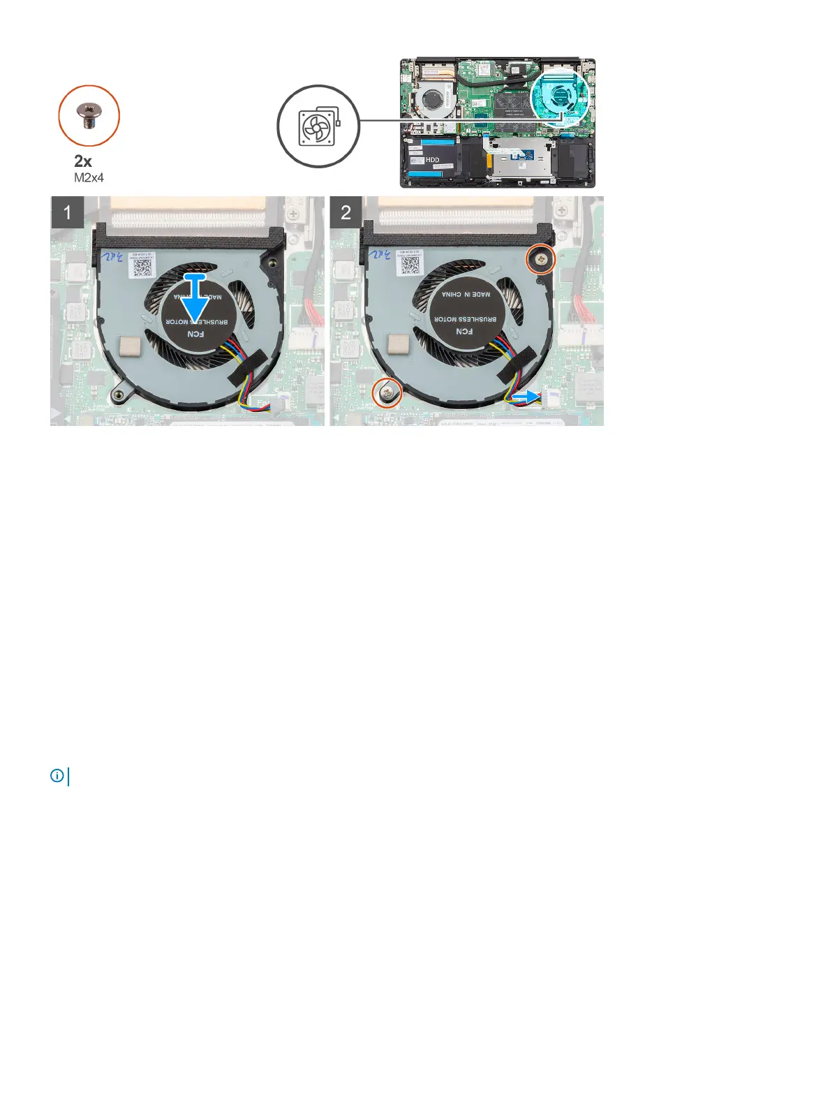 3 Replace the two (M2x4) screws to secure the CPU fan to the palm-rest and keyboard assembly.