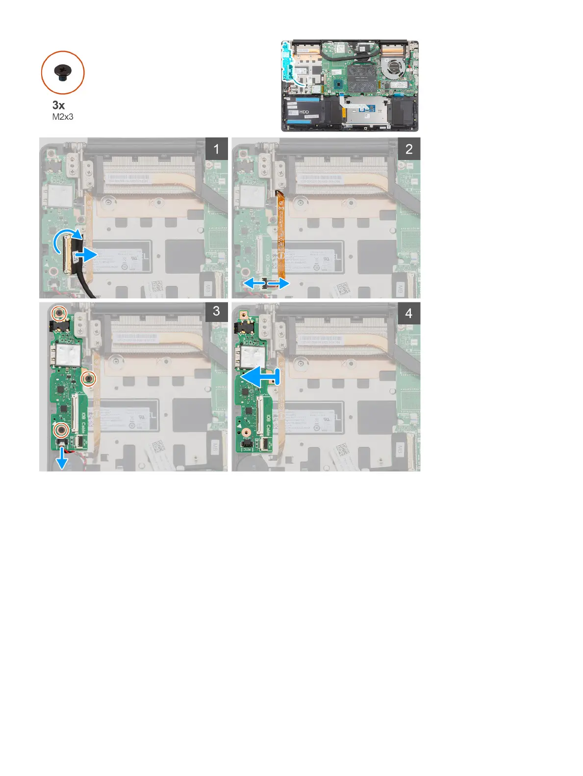 4 Remove the three screws (M2x3) that secure the I/O board to the palm-rest and keyboard assembly.