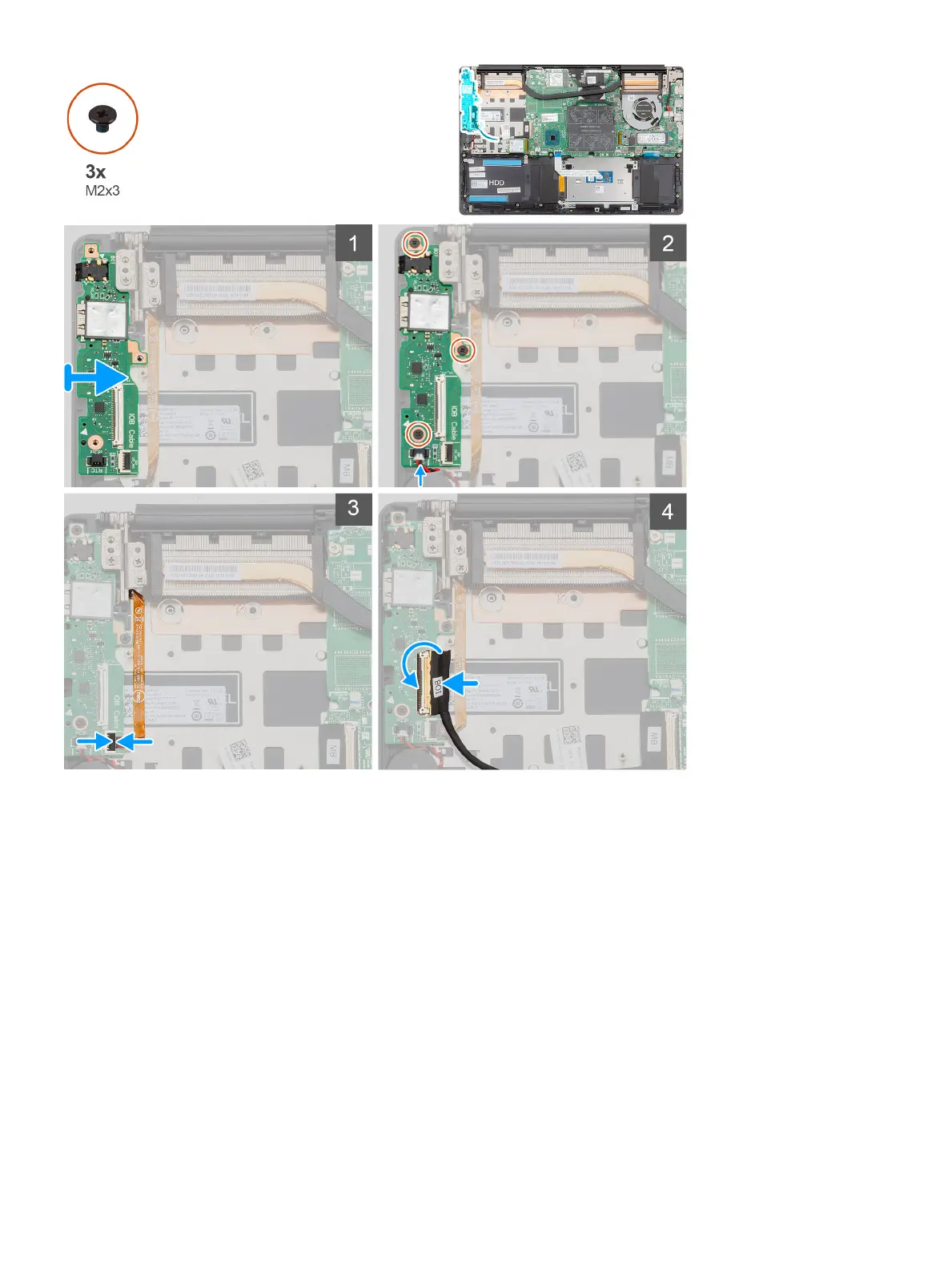 3 Replace the three screws (M2x3) that secure the I/O board to the palm-rest and keyboard assembly.