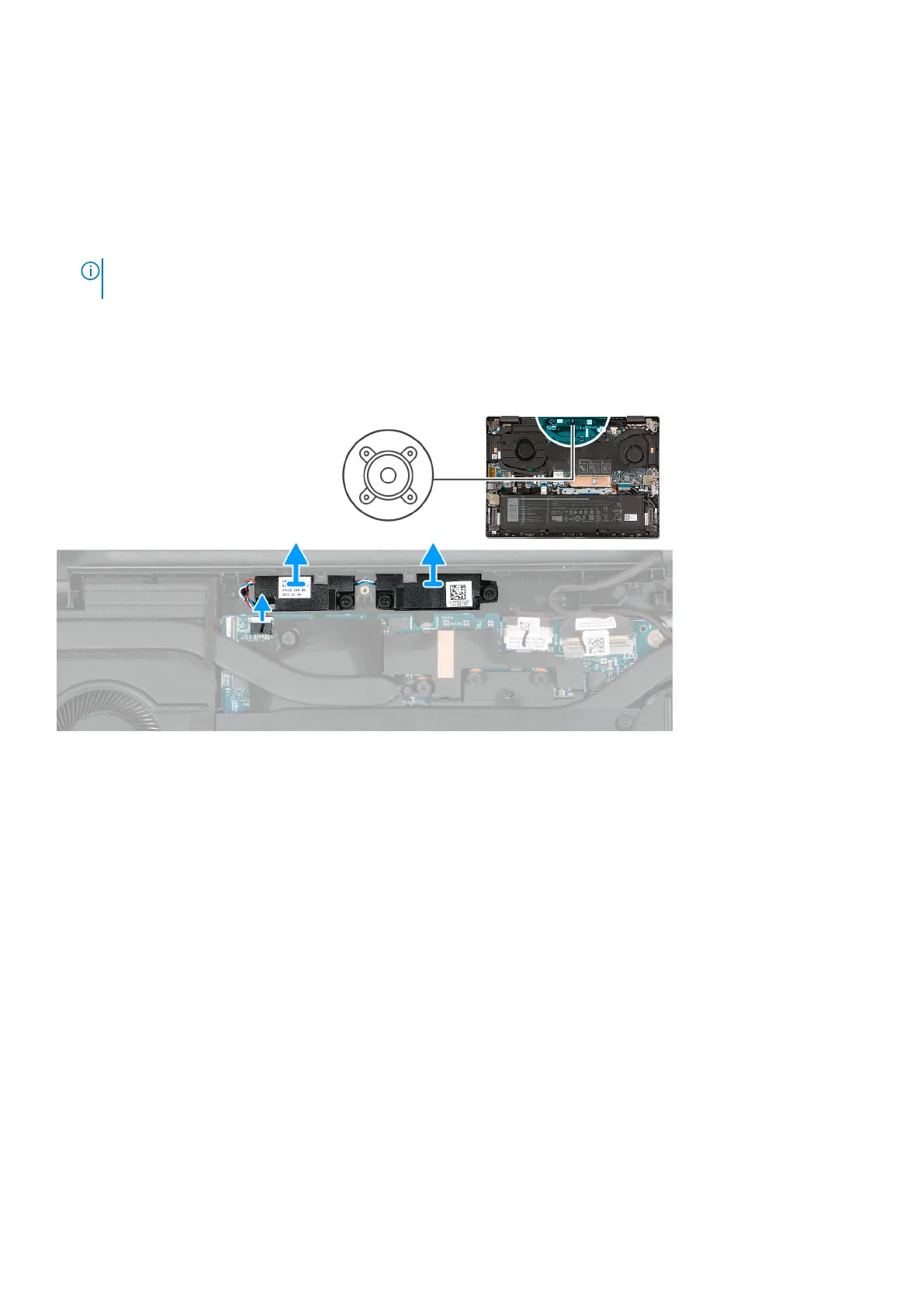 2. Lift the speakers (tweeters) and their cables off the palm-rest and keyboard assembly.