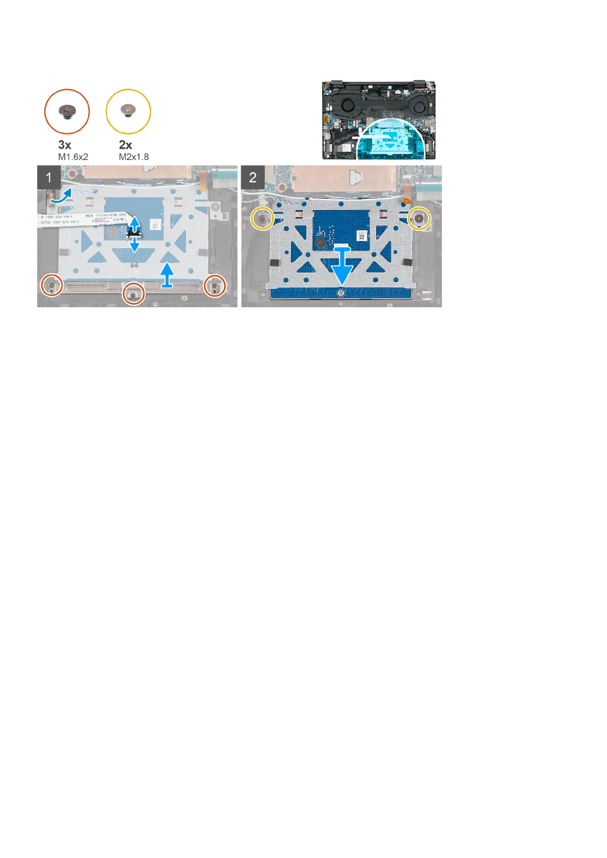5. Remove the two screws (M2x1.8) that secure the touchpad to the palm-rest and keyboard assembly.