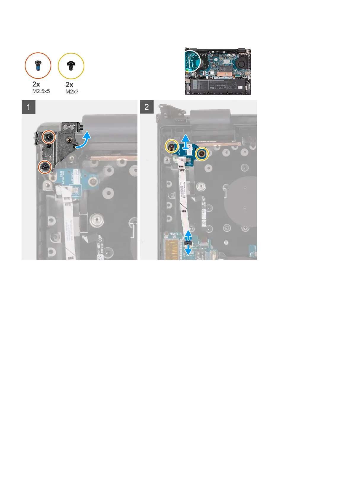 4. Remove the two screws (M2x3) that secure the power-button board to the palm-rest and keyboard assembly.