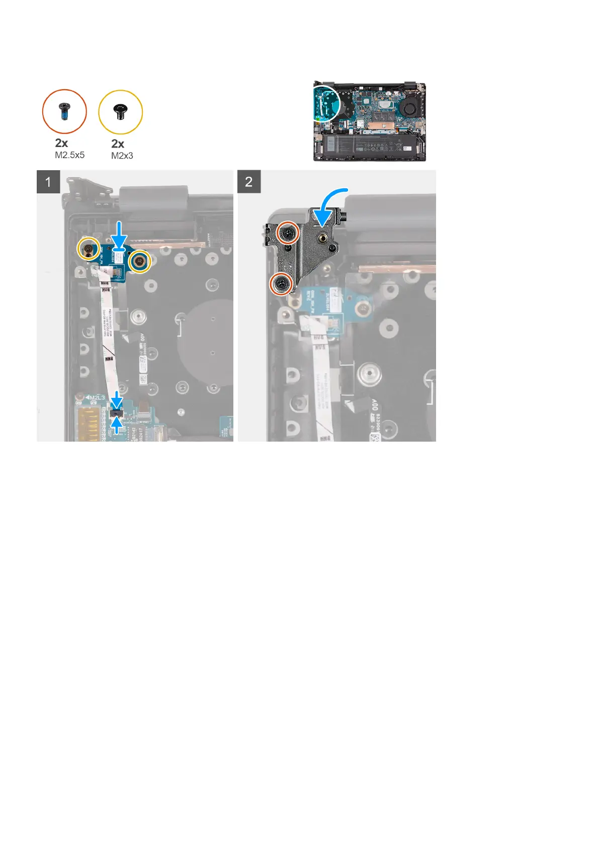 3. Replace the two screws (M2x3) that secure the power-button board to the palm-rest and keyboard assembly.