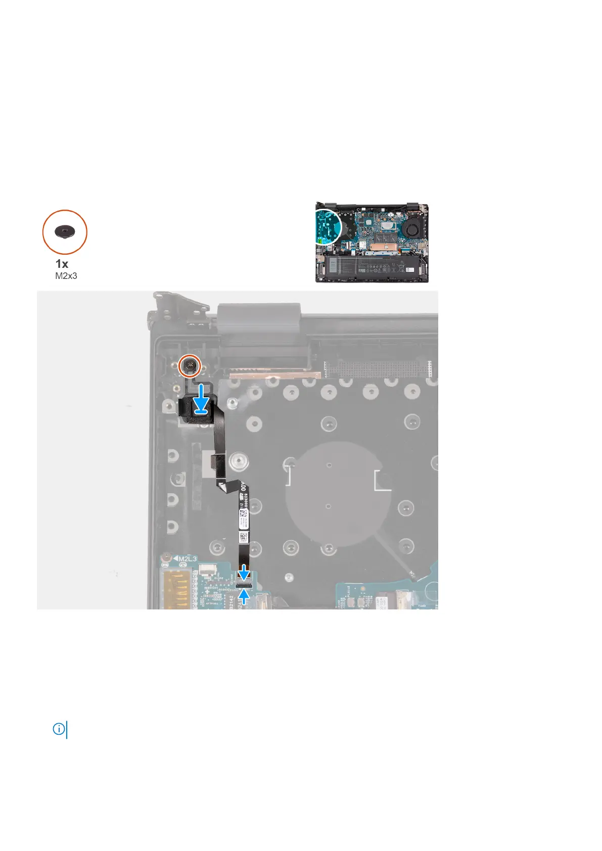 3. Replace the screw (M2x3) that secures the power button with optional fingerprint reader to the palm-rest and keyboard
