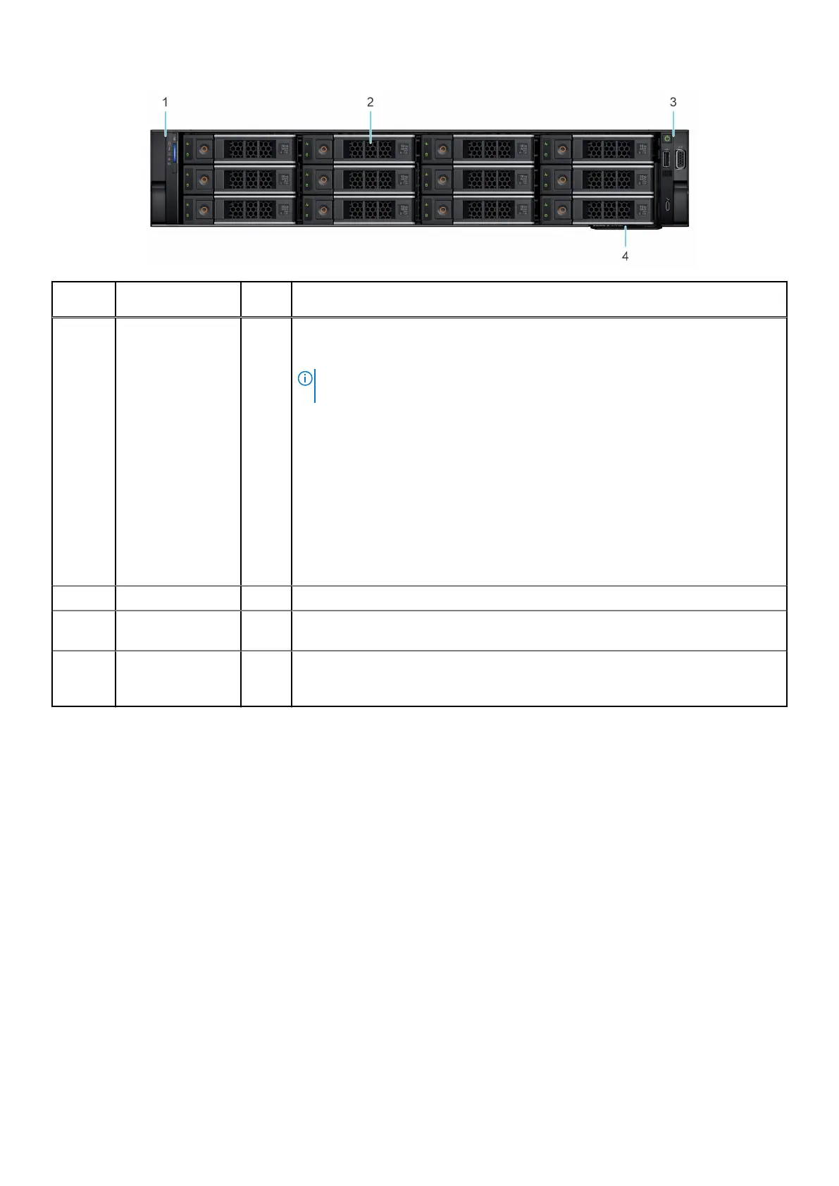 3 Right control panel N/A Contains the power button, USB port, iDRAC Direct micro port, and the iDRAC