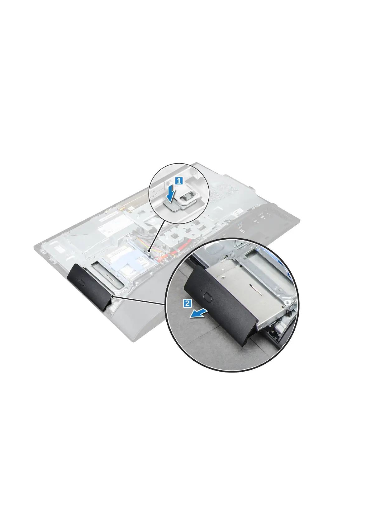 a. Press the securing tab at the base of the drive to release the optical drive assembly [1].