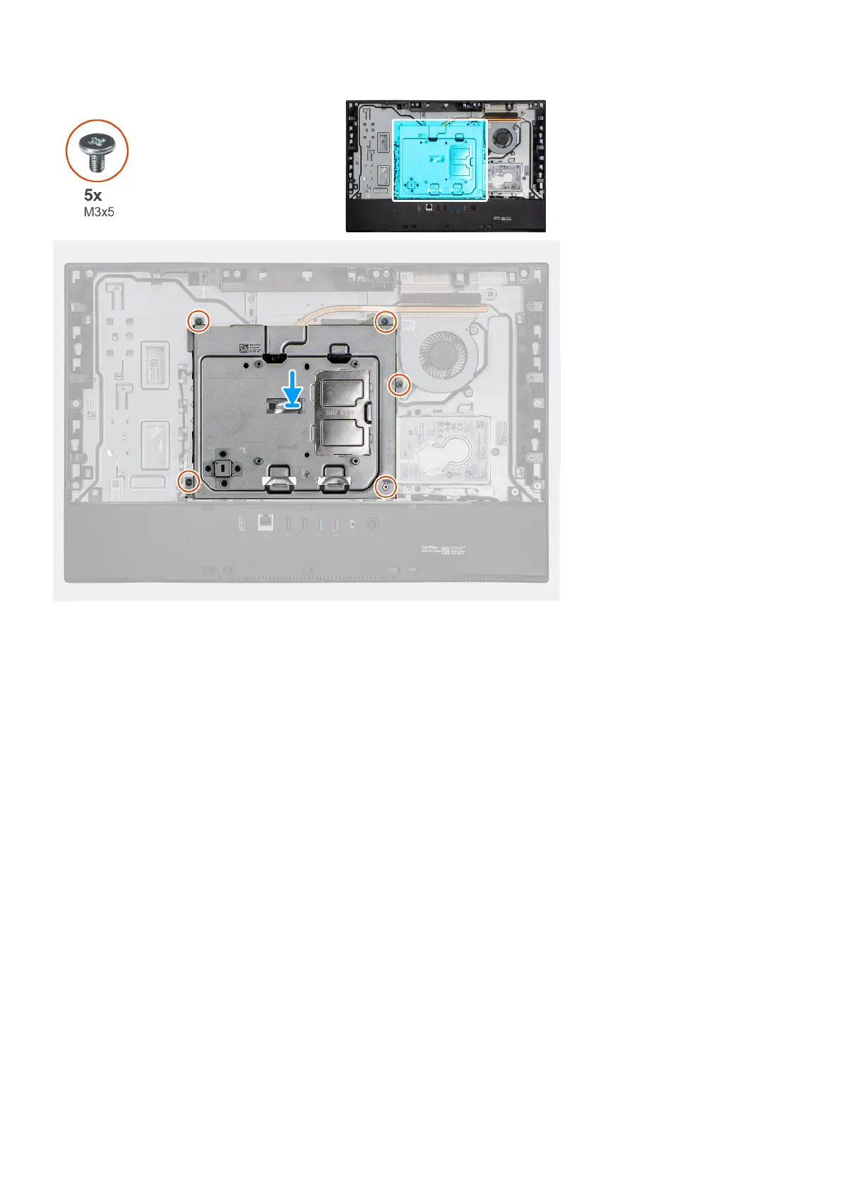 2. Replace the five screws (M3x5) to secure the system-board shield to the display-assembly base.