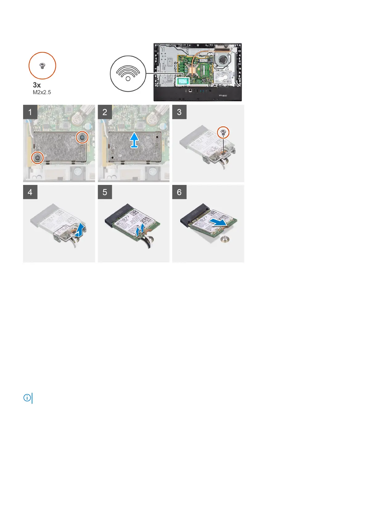 6. Disconnect the antenna cables from the wireless card.