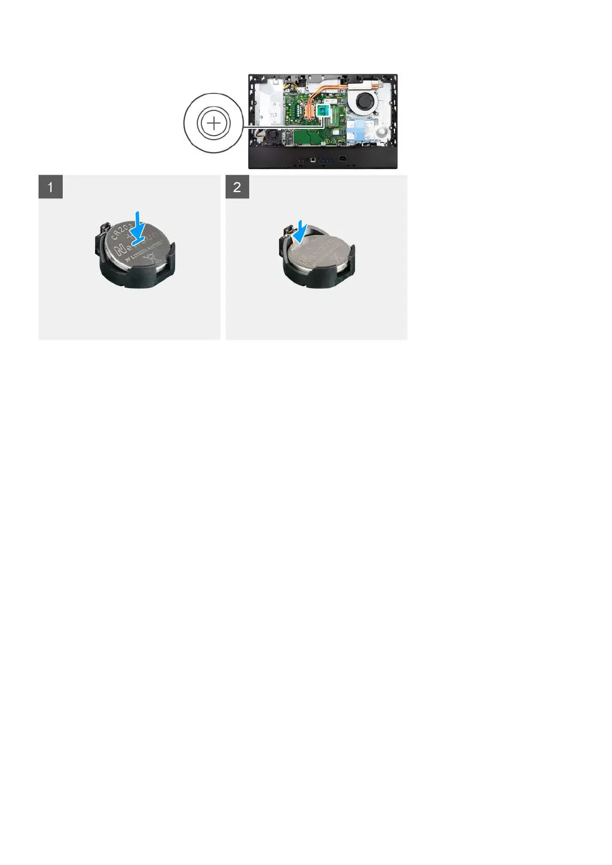 With the positive-side facing up, insert the coin-cell battery into the battery holder on the system board and gently press the