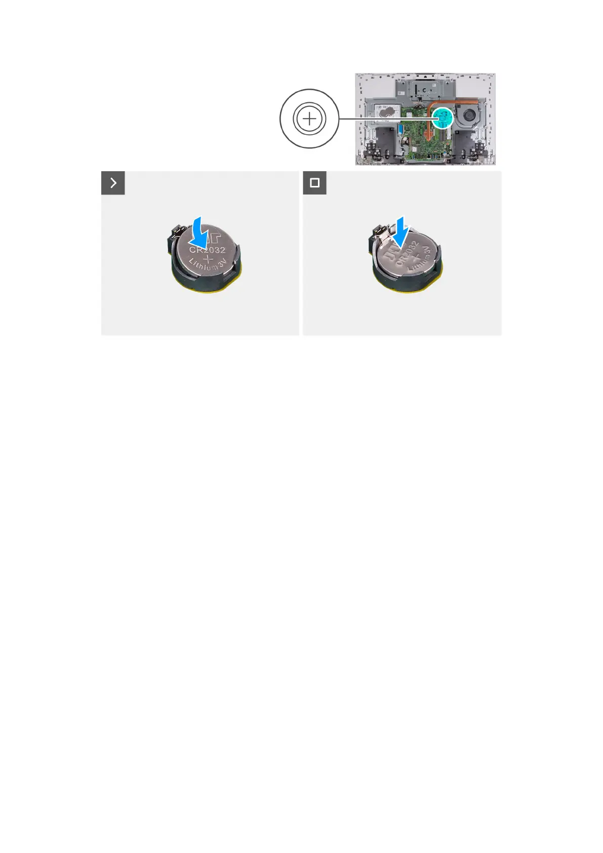 With the positive-side facing up, insert the coin-cell battery into the battery socket on the system board and snap the battery