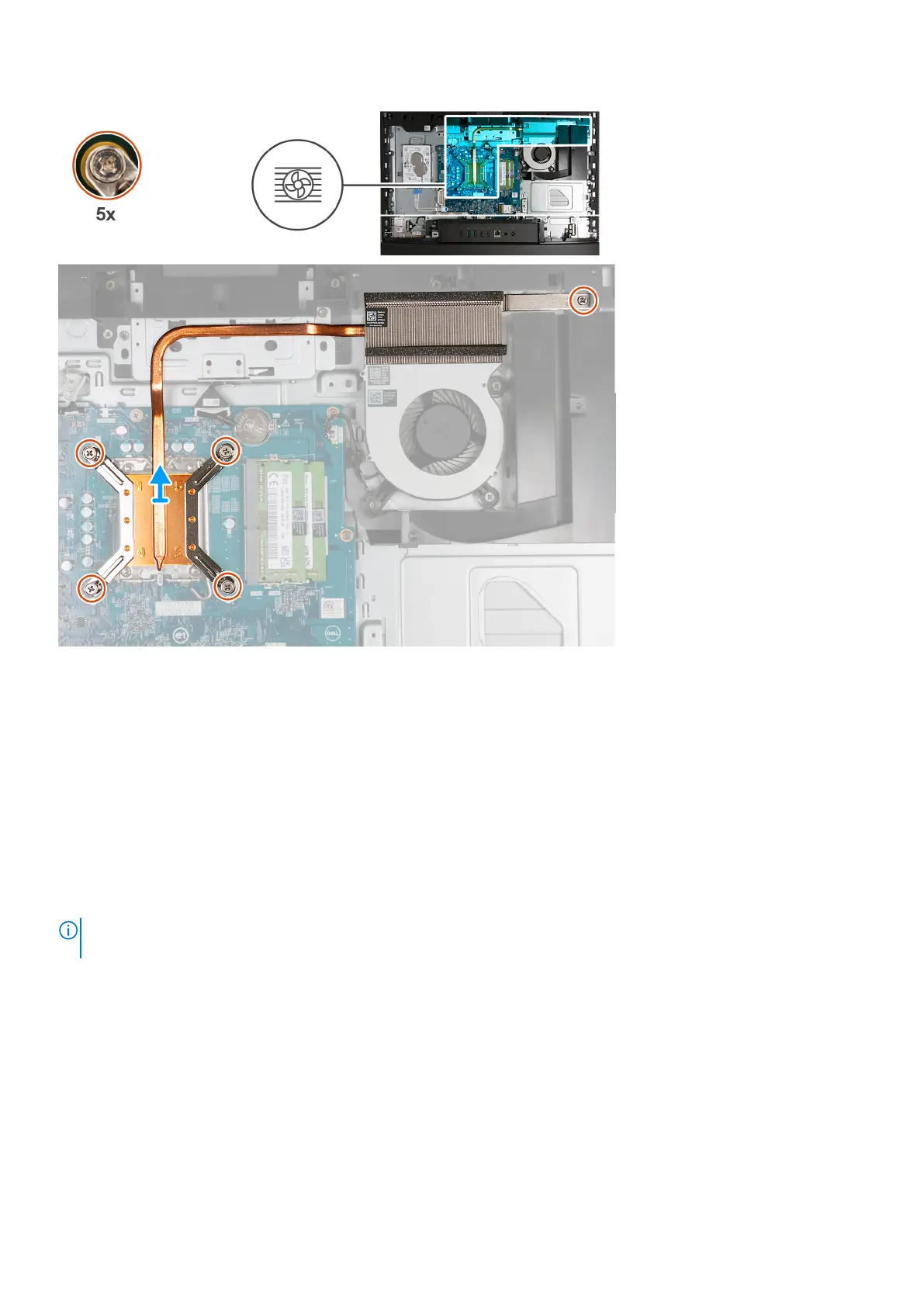 1. In reverse sequential order (5>4>3>2>1) loosen the five captive screws that secure the heat sink to the system board and