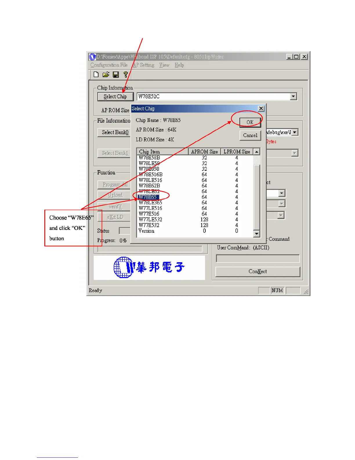 b. Click the “Select Chip” button, and choose the type you are going to program.