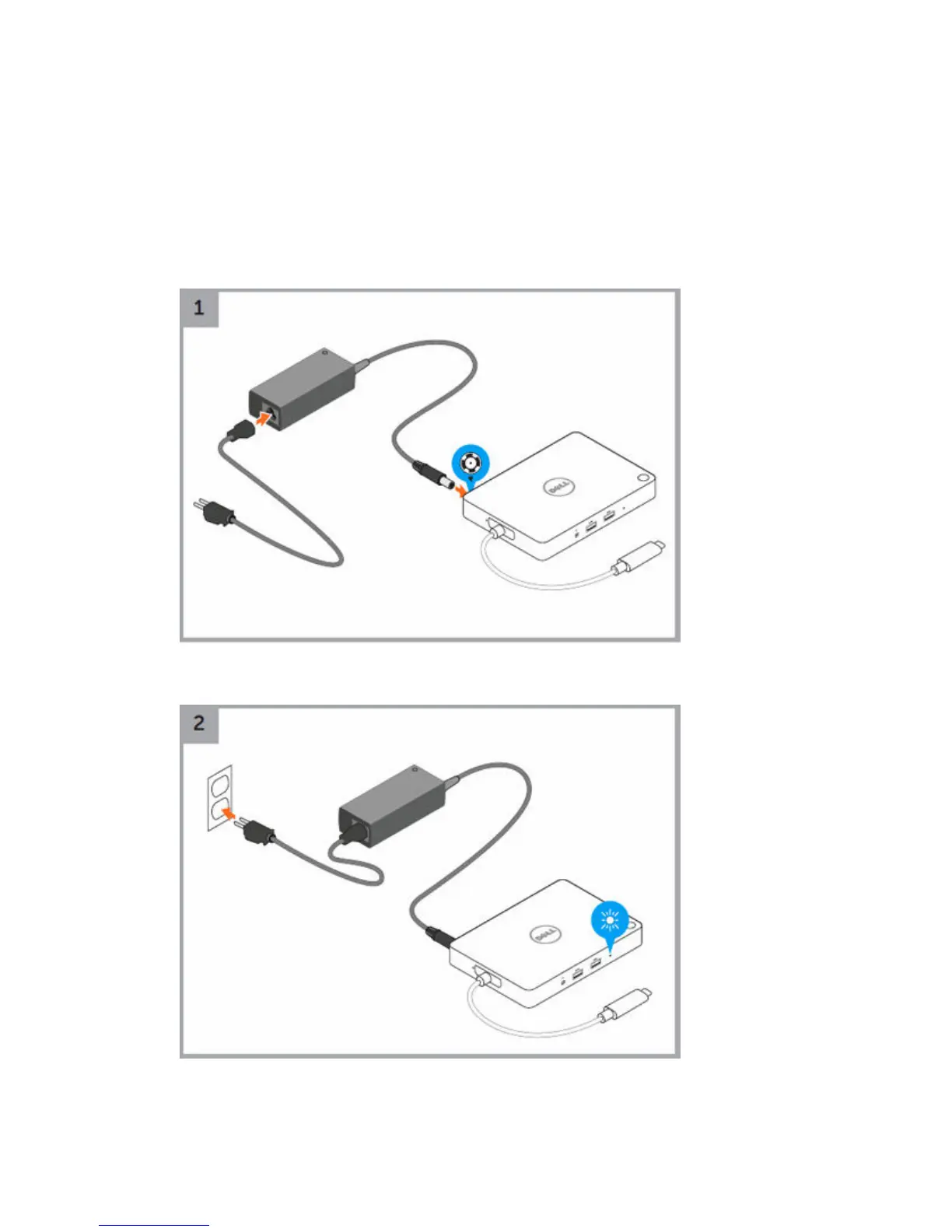 1. Connect the AC adapter to the 7.4 mm DC-in power input on the Dell Docking Station WD15.