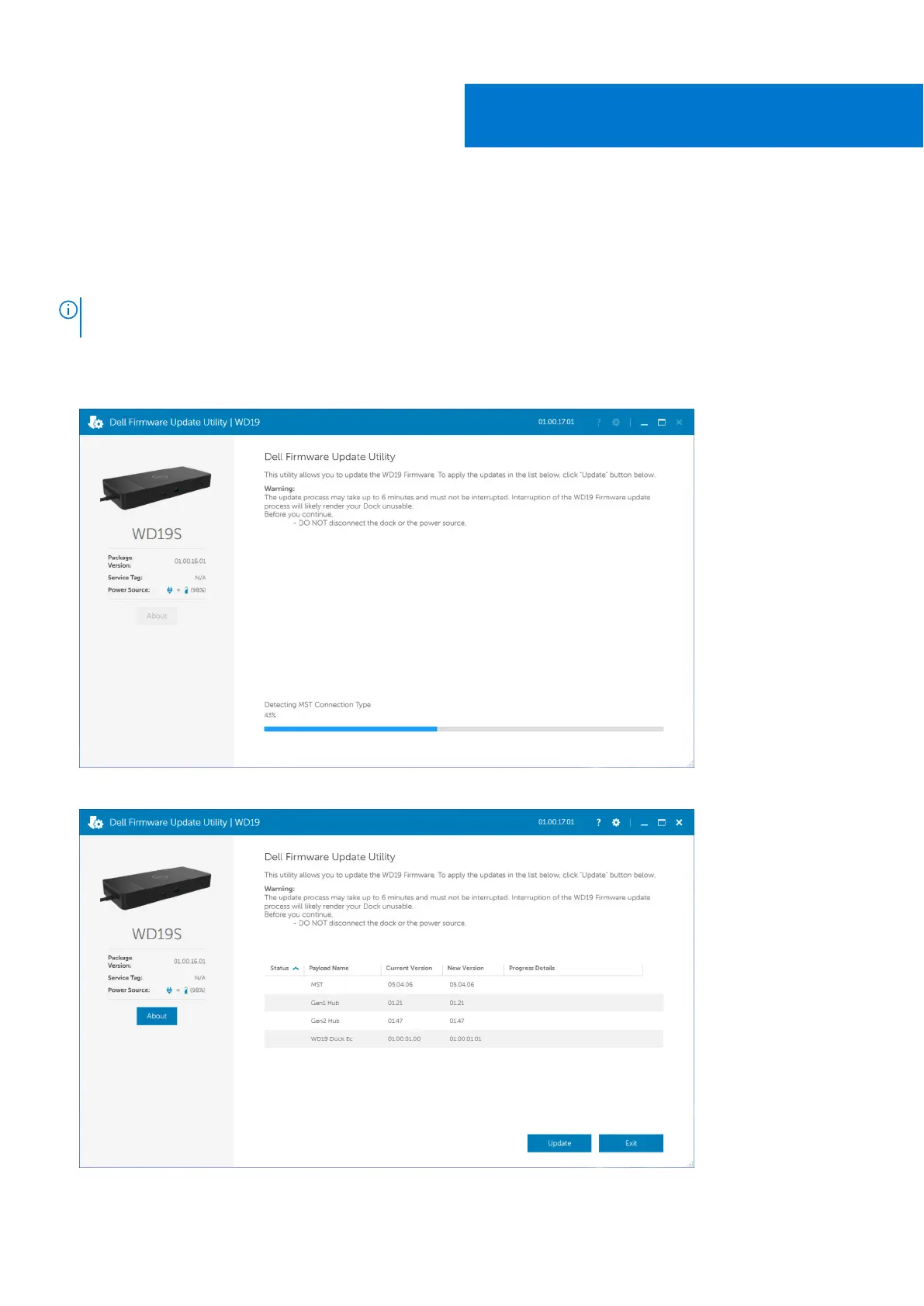 Download the WD19S driver and firmware update from www.dell.com/support. Connect the dock to the system and start the