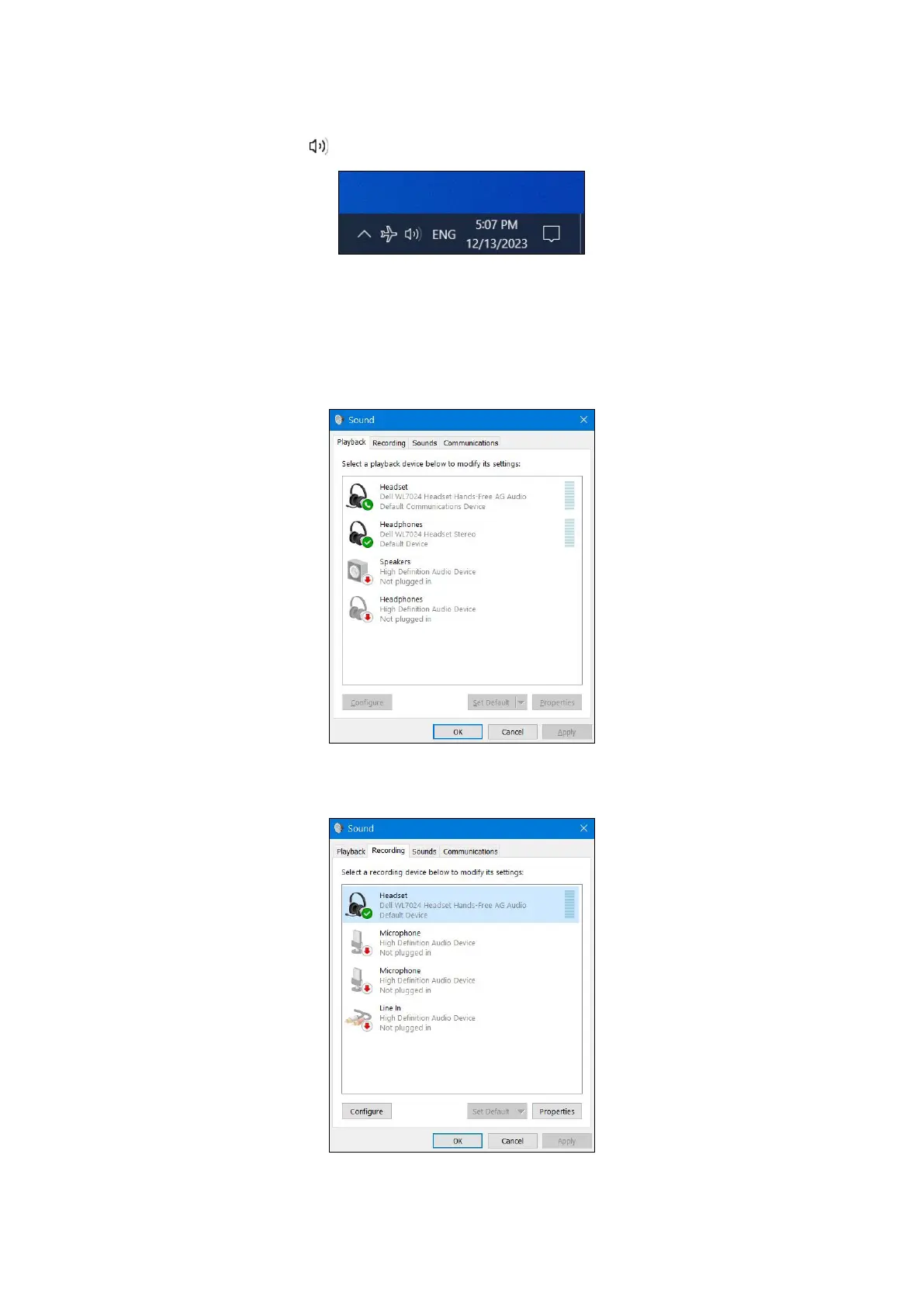 3. Click the Recording tab and set the Dell Headset WL7024 as the default device. Adjust headset microphone volume and computer