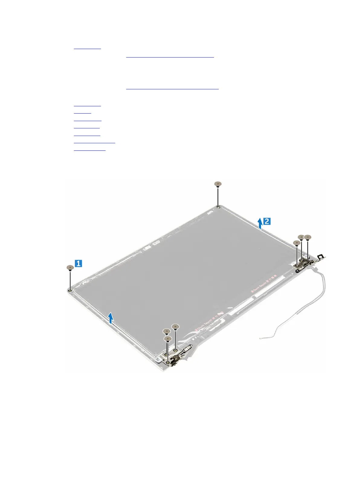 a. Remove the screws that secure the display panel hinges [1].