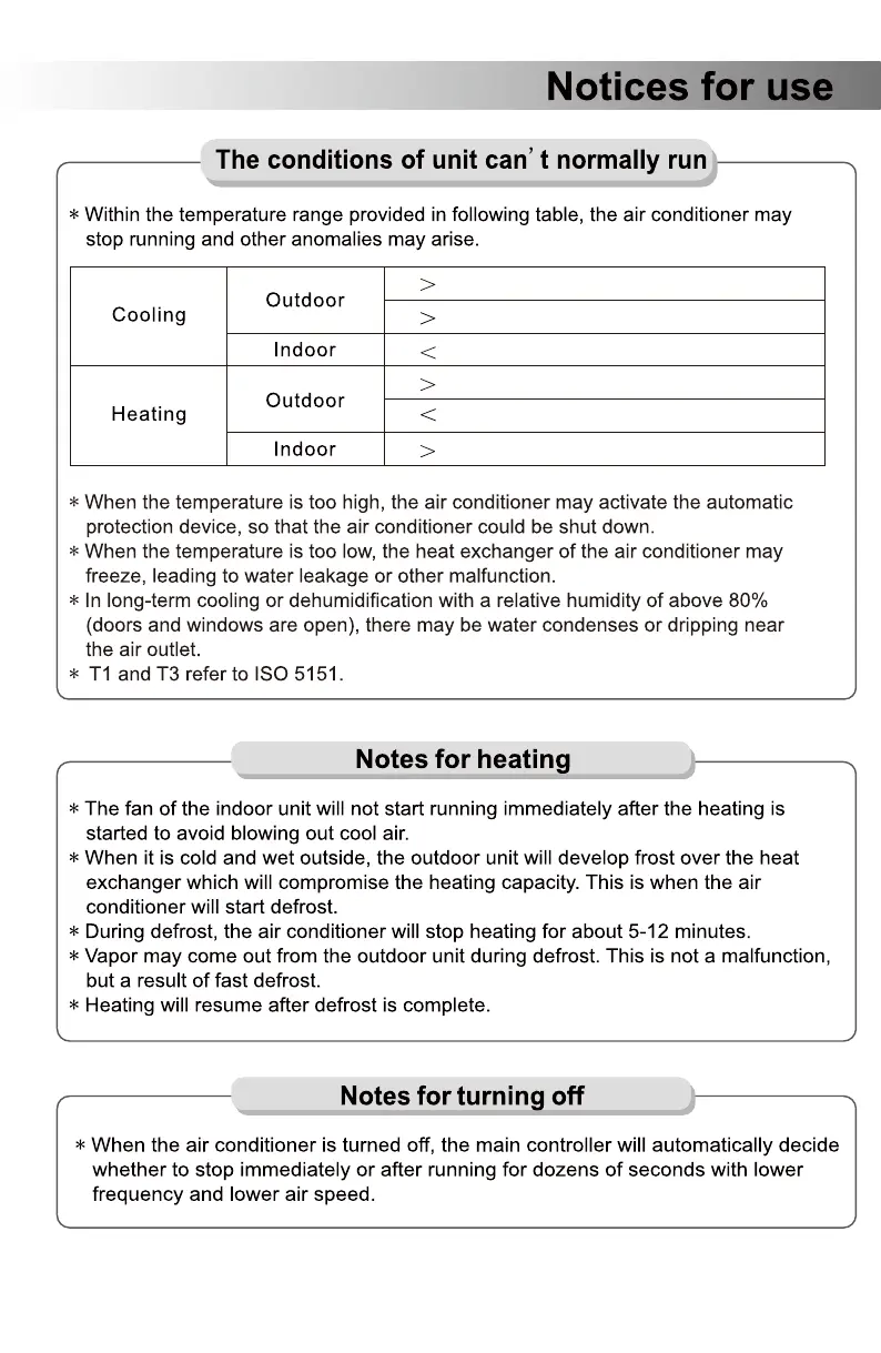 DELLA 048-MS-12 - Notices for Use; Operating Temperature Limits; Heating Operation Notes; Shutdown Operation Notes