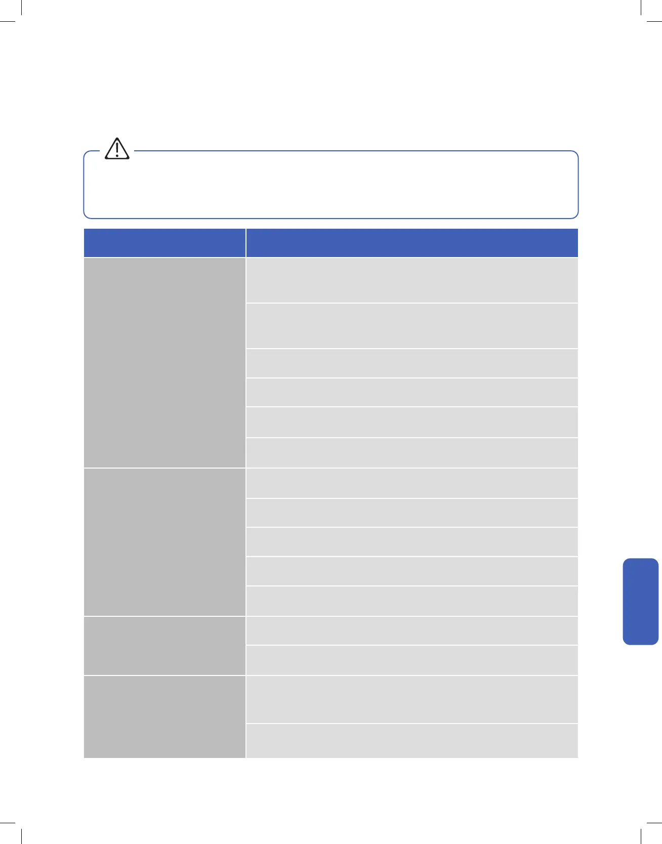 • When encountering persisting problem, stop operation and turn off the breaker. Continue operation in an abnormal condition may