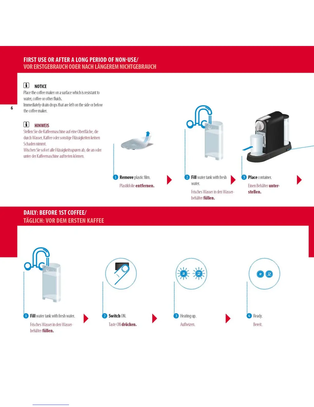 DeLonghi Citiz - Initial Setup and Daily Use; First Use or After Long Non-Use; Daily Operation: Before First Coffee