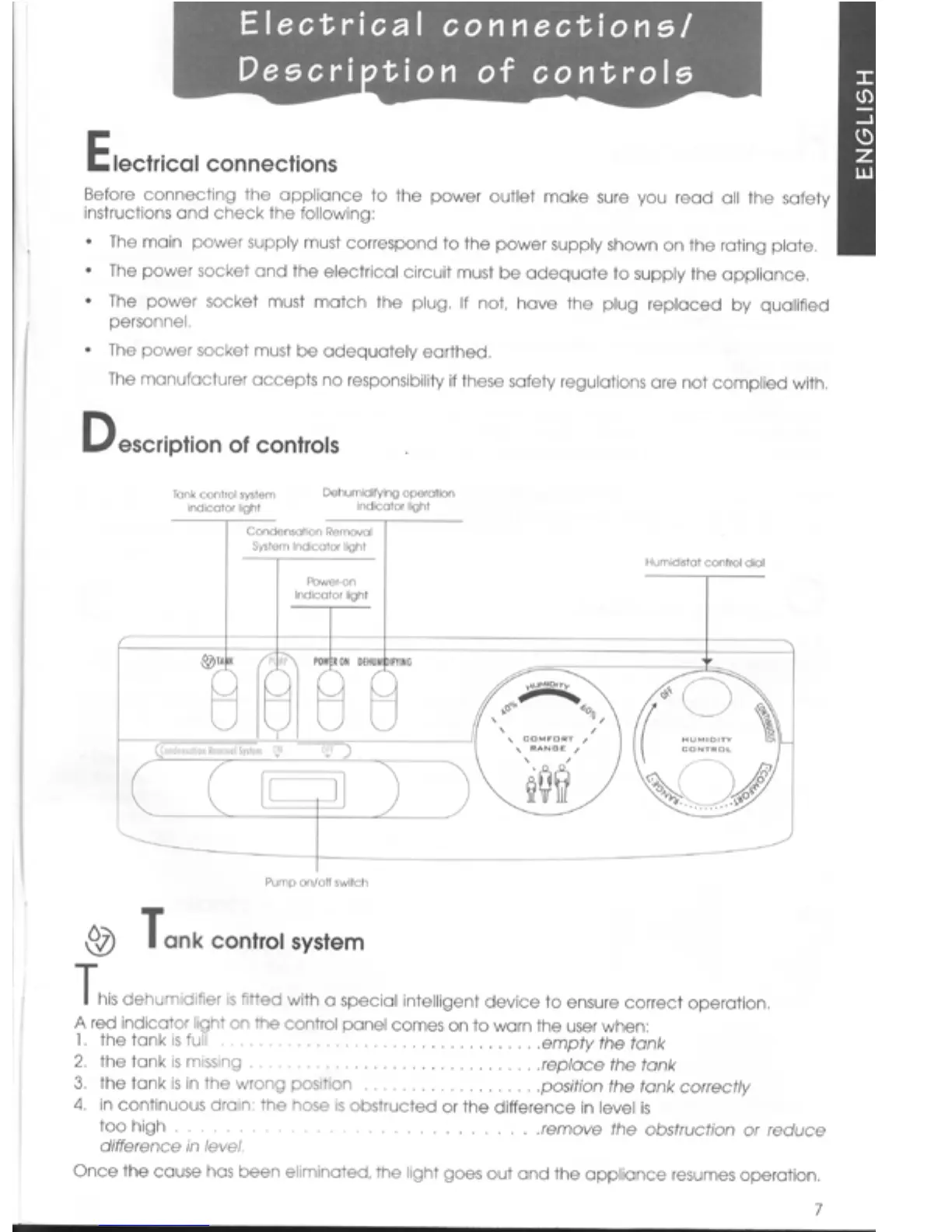 DeLonghi DE40P - Controls, Indicators, and Electrical Setup; Electrical Connection Safety; Control Panel Overview; Tank Control System Functionality