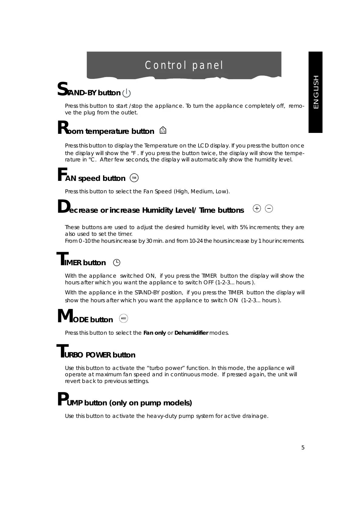 These buttons are used to adjust the desired humidity level, with 5% increments; they are